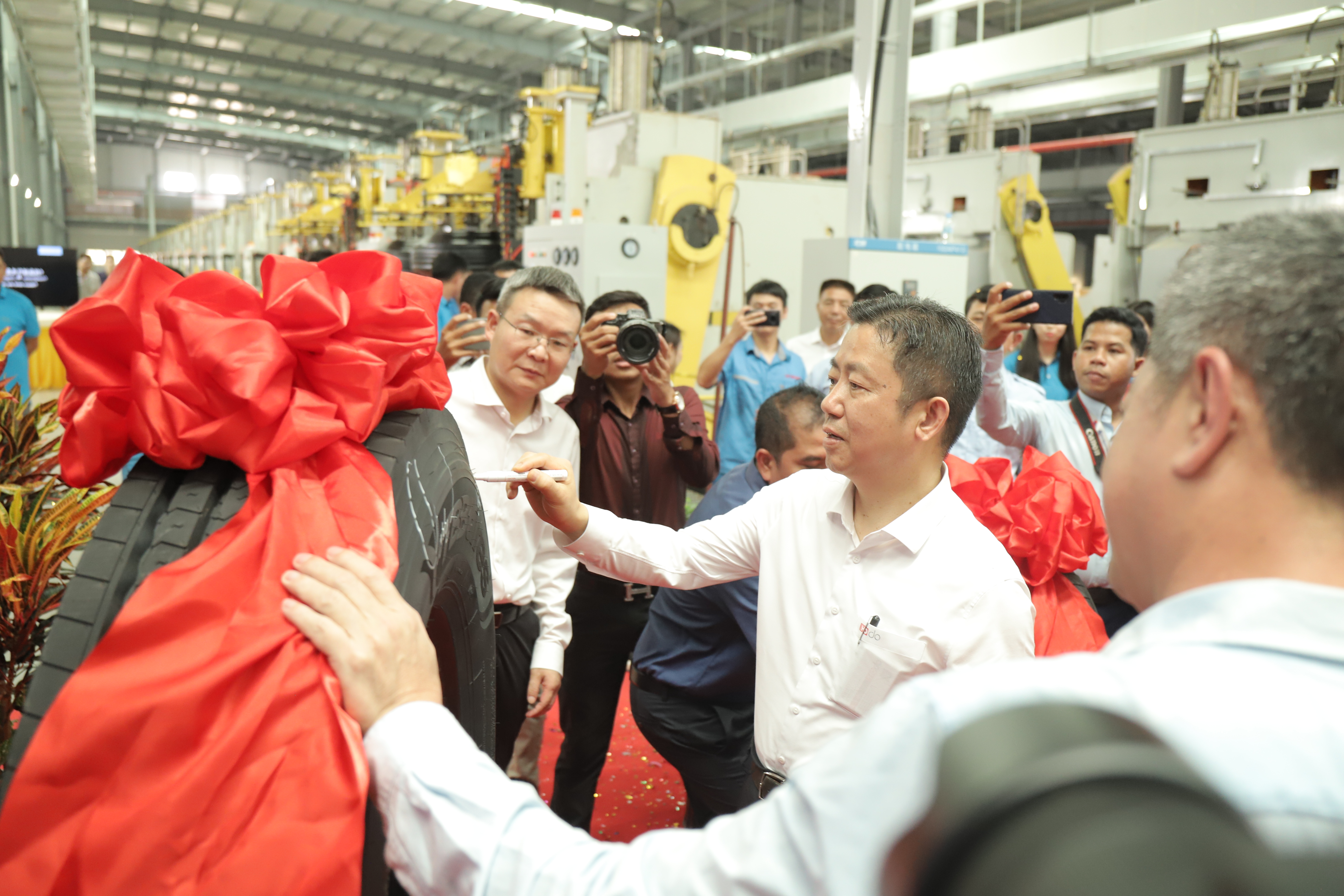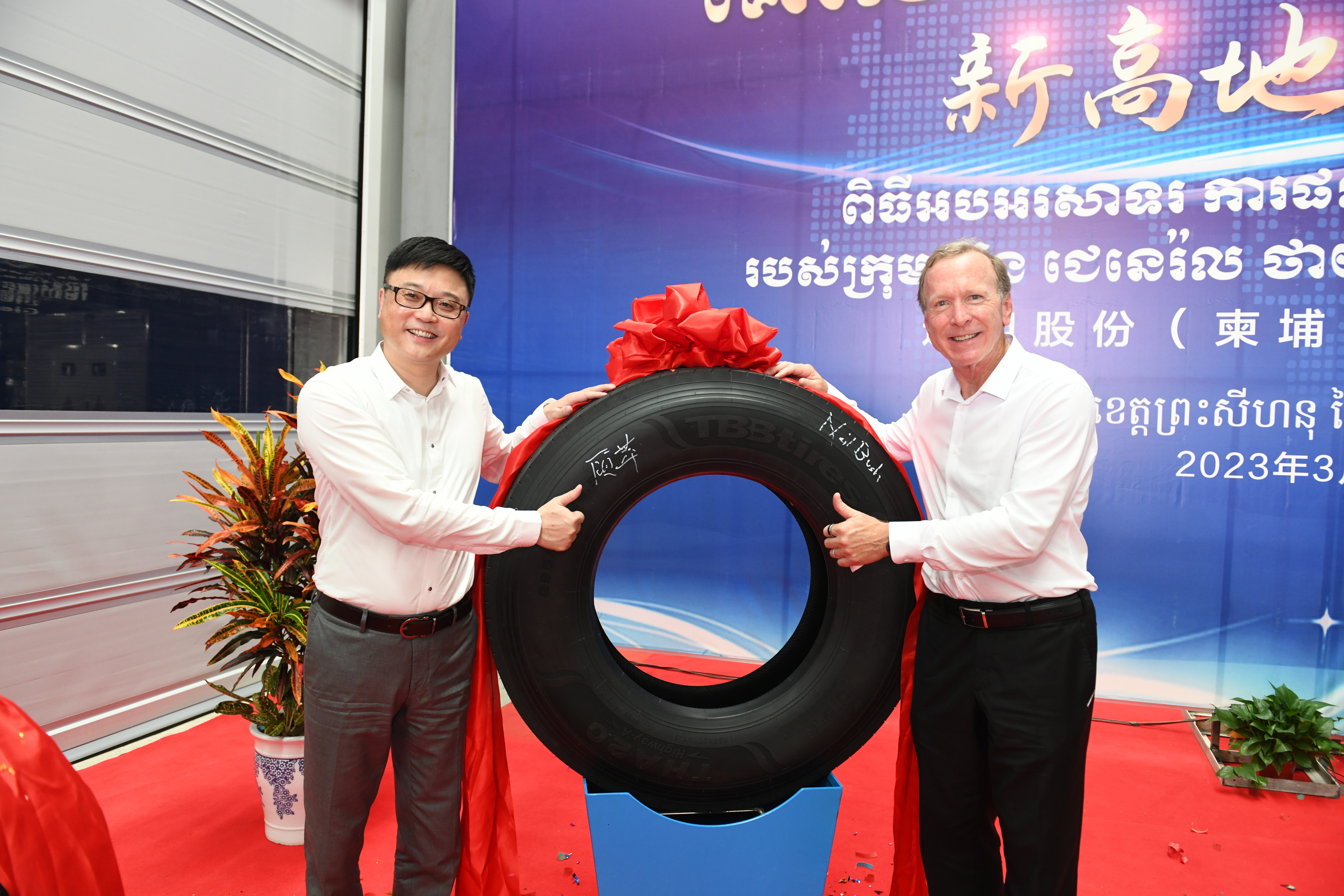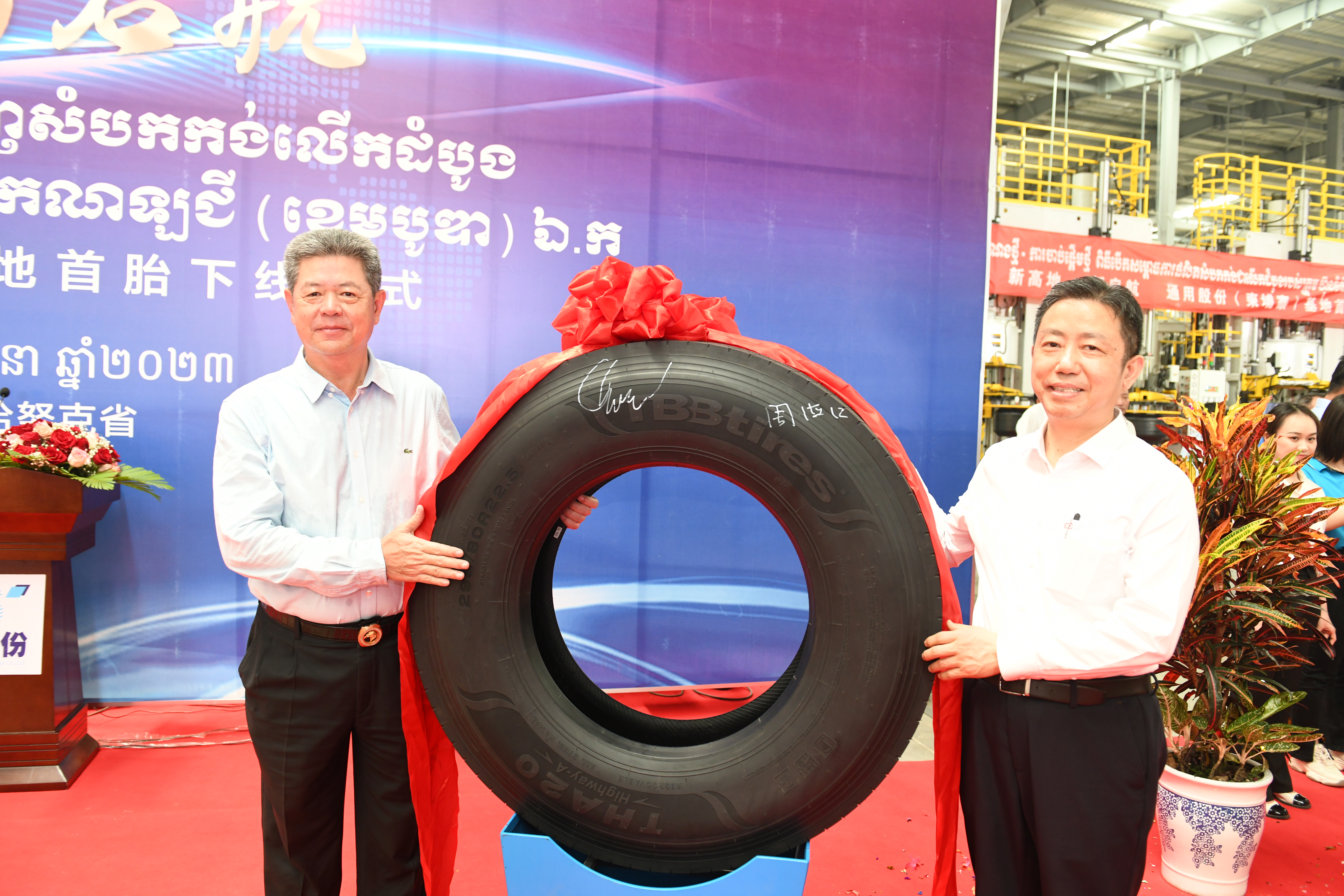 “5、4、3、2、1,出鍋!.......”3月18日,在通用輪胎科技柬埔寨公司總經理陶國忠的倒數聲中,柬埔寨工廠首胎成功下線,標志著通用股份海外“雙基地”的正式建成、全面啟航。在首胎下線儀式上,西哈努克省省長郭宗仁、喬治·布什美中關系基金會創始人兼主席尼爾·布什,中國民營經濟國際合作商會會長、紅豆集團董事局主席周海江,通用股份董事長顧萃等相關領導和全體員工共同見證了這一歷史時刻。